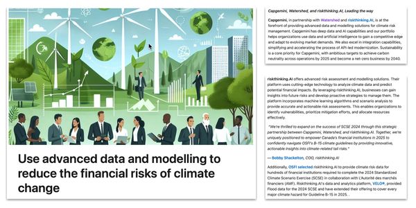This strategic partnership between Capgemini, Watershed, and riskthinking.AI helps businesses proactively manage climate-related financial risks through advanced data and modeling. Combining Capgemini’s AI expertise, Watershed’s sustainability management, and riskthinking.AI’s climate risk analytics, companies can confidently navigate OSFI’s Guideline B-15, turning compliance into strategic advantage and enhancing resilience.